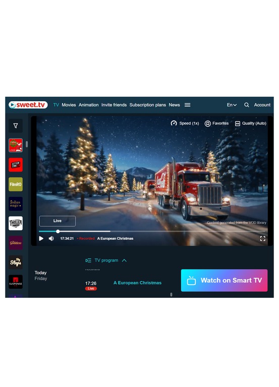 București (MEDIA EXPRES) / 5 dec 2025 / Platforma de streaming Sweet.tv a inclus în grila sa de programe, începând cu data de 28 noiembrie, televiziunea "Magical Christmas HD", un serviciu de tip FAST (Free Ad-supported Streaming Television) care difuzează continuu filme tematice de Crăciun, conform programului electronic afișat de operator.