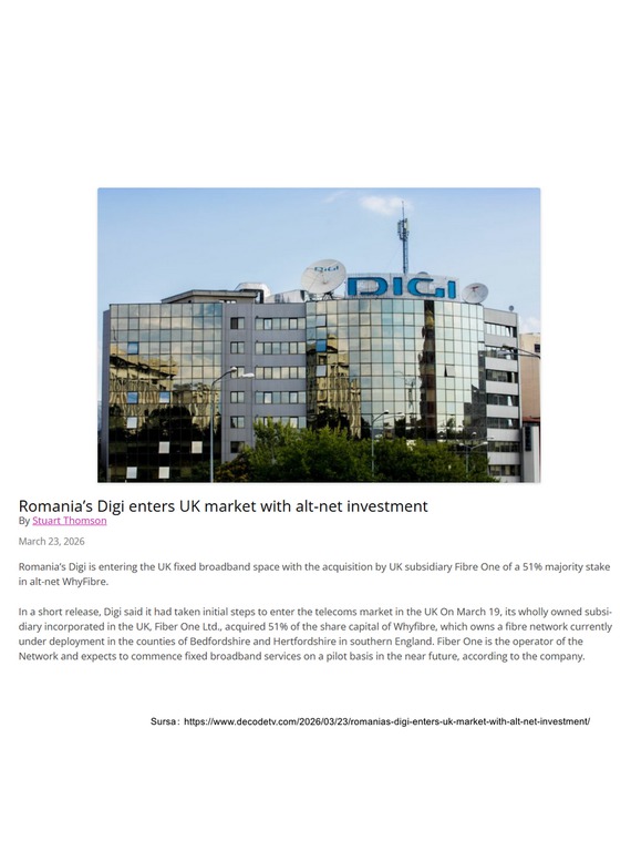 București (MEDIA EXPRES) / 24 mar 2026 / Fiber One Ltd. deținută de Digi a achiziționat pachetul majoritar de 51% din capitalul social al operatorului britanic Whyfibre Limited pentru a lansa servicii de internet prin fibră optică în sudul Angliei, conform unui raport curent transmis Bursei de Valori București (BVB).