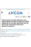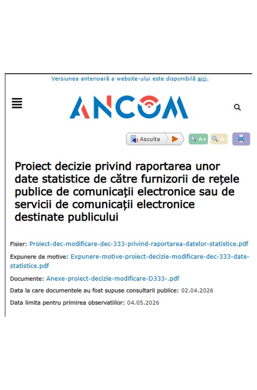 București (MEDIA EXPRES) / 2 apr 2026 / Autoritatea Națională pentru Administrare și Reglementare în Comunicații (ANCOM) a lansat în consultare publică până la 4 mai un proiect de decizie care vizează actualizarea indicatorilor statistici raportați de furnizorii de rețele și servicii de comunicații electronice, pentru a reflecta schimbările tehnologice din piață.