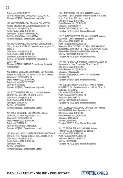 192. BRIDGE MEDIA SOLUTIONS SRL, CUI: 42663858, Televiziuni: ROMÂNIA TV,