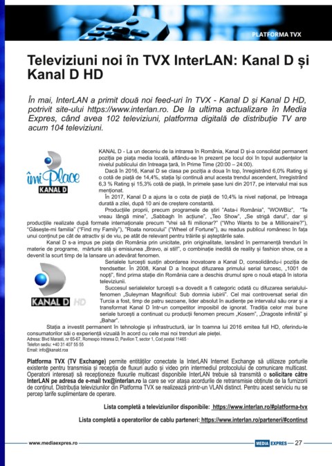 În mai, InterLAN a primit două noi feeduri în TVX Kanal D și Kanal D HD,